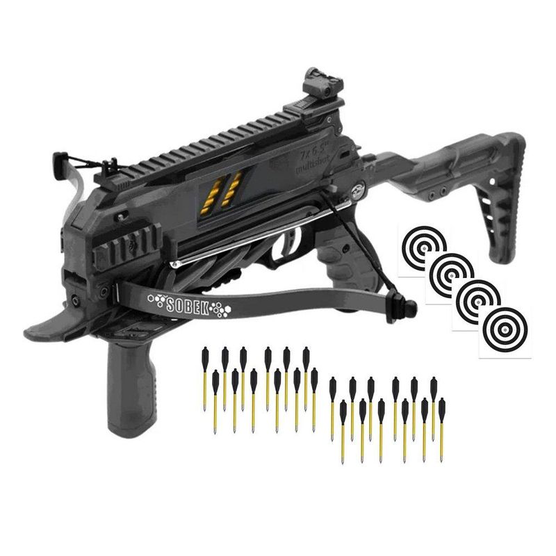 Para máxima versatilidade, a Sobek conta com quatro trilhos Picatinny (superior, inferior e laterais), possibilitando a instalação de miras ópticas, lanternas, lasers e diversos acessórios. Tudo isso aliado a uma construção robusta, com membros em fibra de vidro e um corpo resistente que garantem durabilidade e desempenho constante.