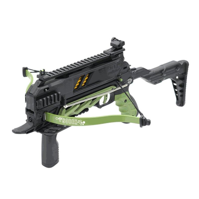 Para máxima versatilidade, a Sobek conta com quatro trilhos Picatinny (superior, inferior e laterais), possibilitando a instalação de miras ópticas, lanternas, lasers e diversos acessórios. Tudo isso aliado a uma construção robusta, com membros em fibra de vidro e um corpo resistente que garantem durabilidade e desempenho constante.