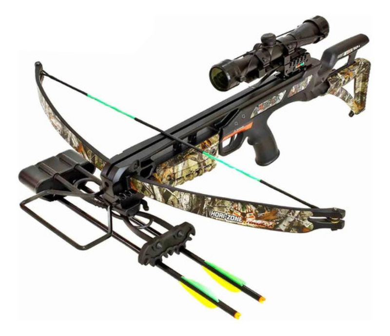 Construída com exclusivo camuflado desenvolvido pela Hori-Zone, fabricação do limbo em fibra de vidro, corpo em alumínio e coronha em polímero.