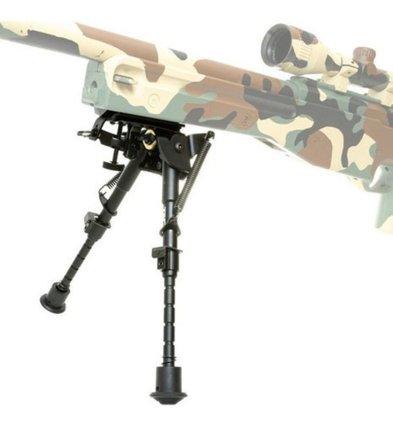 O bipé é um ótimo acessório dobrável para atiradores que utilizam equipamento pesados. Ele facilita que sua precisão seja maior, permitindo girar e inclinar para perfeito ajuste em terrenos planos e não planos.