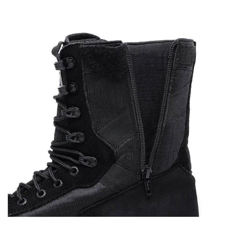 Este modelo combina couro premium com tecido Ripstop de alta resistência, um material tático conhecido por sua durabilidade, resistência à abrasão e leveza. O couro de 2 mm de espessura proporciona proteção estrutural, enquanto o Ripstop colabora com a flexibilidade e ventilação, criando um calçado que oferece desempenho tático sem pesar nos pés.