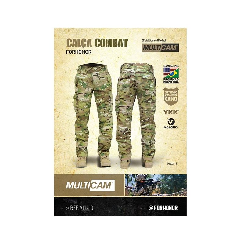 Calça Tática FOR HONOR. Confeccionada em tecido Rip stop, com camuflagem contra IV (raios infra-vermelhos) e baixa fluorescência sob luz ultra-violeta, 50% poliamida e 50% algodão com ligamento em tela Nyco Rip Stop. Reforço duplo de tecido Rip Stop no joelho possui joelheira externa rígida em polímero, integrada e removível, com abertura integrada quando a joelheira não for usada.