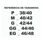 P - Corresponde ao tamanho 38/40M - Corresponde ao tamanho 40/42G - Corresponde ao tamanho 42/44GG - Corresponde ao tamanho 44/46EG - Corresponde ao tamanho 46/48