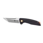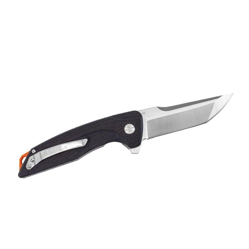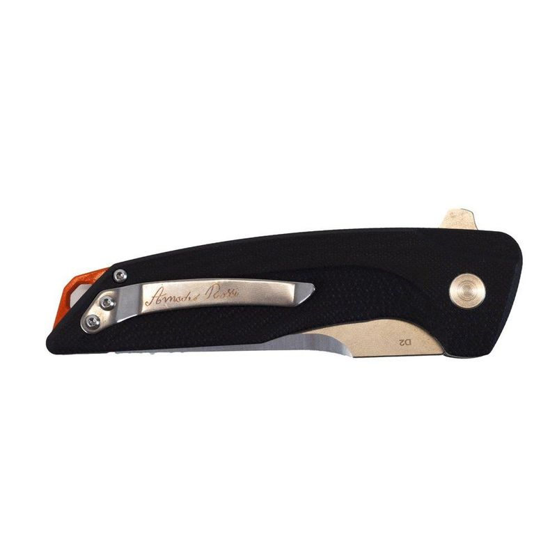 Este modelo impressiona desde o primeiro contato. Sua lâmina do tipo Clip Point, com 88 mm de comprimento e 3,5 mm de espessura, é feita em aço D2 de alta dureza (59 HRC) — um material conhecido pela excelente retenção de fio e resistência ao desgaste. O acabamento escovado com revestimento acetinado reforça a durabilidade e confere um visual elegante e funcional.