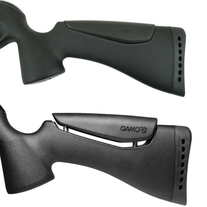 Outro detalhe que melhora a empunhadura e o conforto do atirador é a coronha ter regulagem de altura. Assim se adapta aos diferentes biotipos de atiradores.