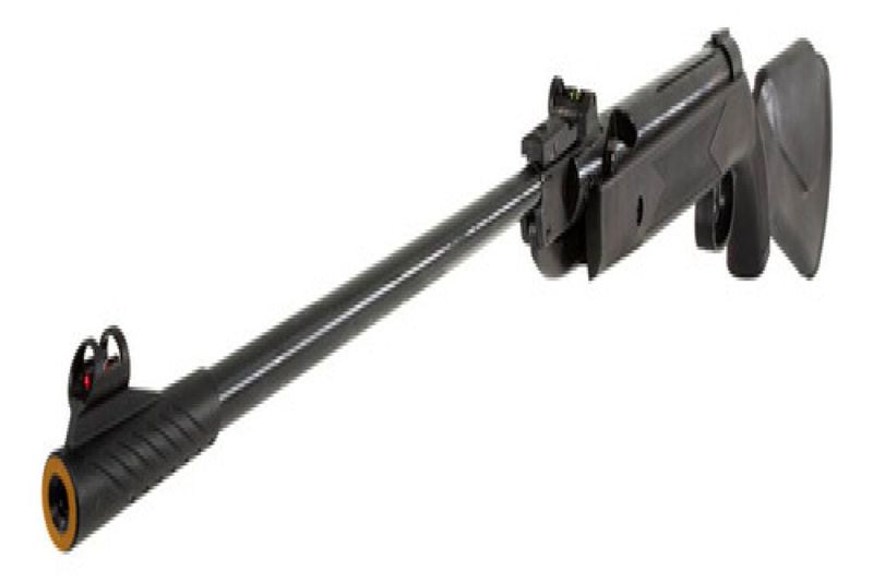 O gatilho de metal e o sistema Easy Open facilitam o uso, enquanto o conjunto de pontaria com fibra óptica e o trilho superior de 11mm para lunetas completam o pacote.