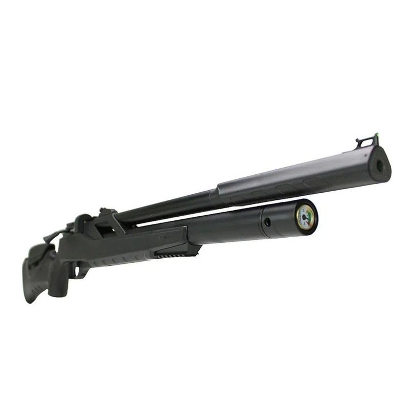 Possui ainda cano em aço micro raiado com supressor de ruídos instalado na ponta do cano, diminuindo consideravelmente o som emitido pela sua carabina, ideal para quem busca um equipamento para ser utilizado em todos os momentos.