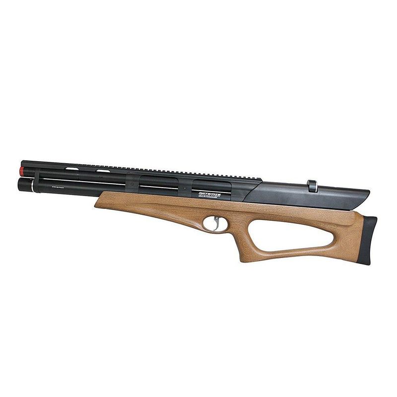 Sua coronha no estilo bullpup chama atenção devido a sua construção, sendo confeccionada inteiramente em madeira maciça, proporcionando um design excepcional, além de aumentar a durabilidade, qualidade e resistência da sua arma. Ainda assim, possui cano em metal micro raiado de precisão com supressor de ruídos integrado, diminuindo consideravelmente o som emitido por sua arma.