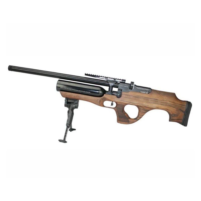 Com magazine pata 12 tiros, velocidade média de 900 fps / 274 m/s, comprimento total de 73 cm e peso de 3,95 kg. Vem com trilhos picatinny para acoplagem de acessórios. Gatilho em metal com fina regulagem. Sua coronha é Bullpup de Madeira Natural, com regulagem na bochecha e soleira de borracha. Tem sistema multishot e/ou mono tiro, com acionamento por alavanca lateral e trava de segurança manual.