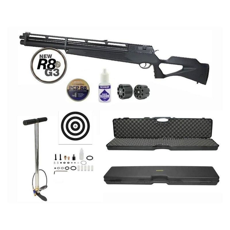 Carabina De Pressão Pcp Rossi R8 G3 Black STD 5,5mm 8 Tiros 350 M/S + Bomba + Case + Alvos