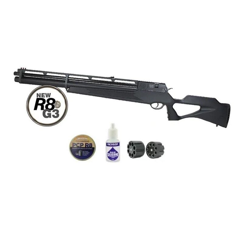 Carabina De Pressão Pcp Rossi R8 G3 Black STD 5,5mm 8 Tiros 350 M/S + Compressor KMD + Alvos