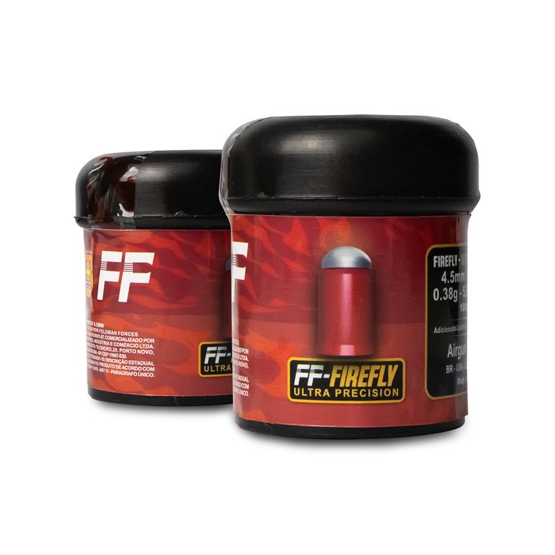 Chumbinho 4.5 mm - Características: Fabricante: FF (Fire Feldman) Calibre: 4.5 mm (.22) Modelo: FIREFLY ULTRA PRECISION Tipo: Chumbinho 4.5 Indicação de uso: Tiro esportivo e caça Peso (chumbinho unitário): 0.38 gramas - 5,87 grams Material: Óxido de titânio, zinco, cobre e verniz deslizante Material da cápsula: Polímero com aditivos especiais FF Cor da cápsula: Laranja Tipo de ponta: Pontiaguda Tipo de saia: Envolto com cápsula de polímero Comprimento: 14 mm Finalidade: Tiros de alta penetração e impacto Velocidade de trajetória (150 bar): 360 m/s Lubrificante: Xspeed-Pro Conteúdo da lata: 100 chumbinhos Peso da caixa: 50 gramas Compatibilidade: Carabina de pressão 4.5 mm Uso recomendado: Carabina PCP e Gás Ram com mais de 15 joules