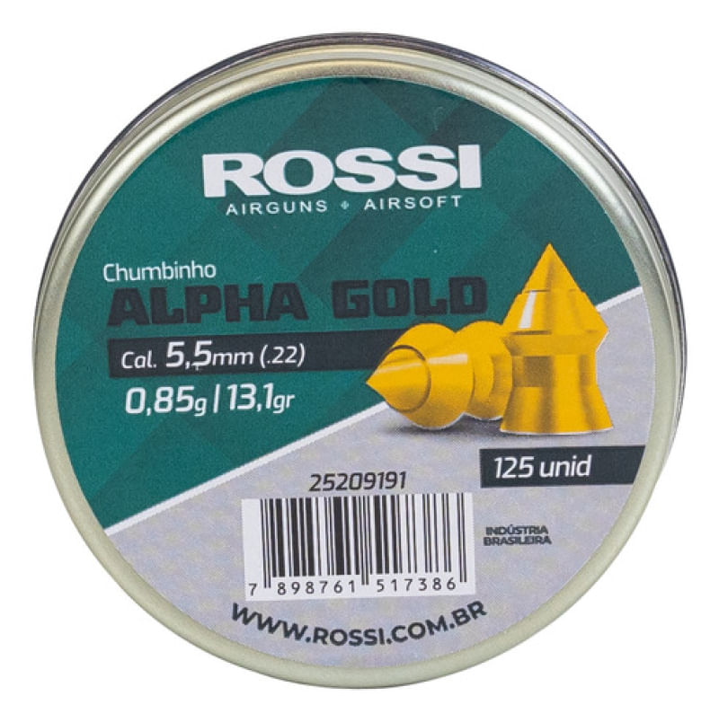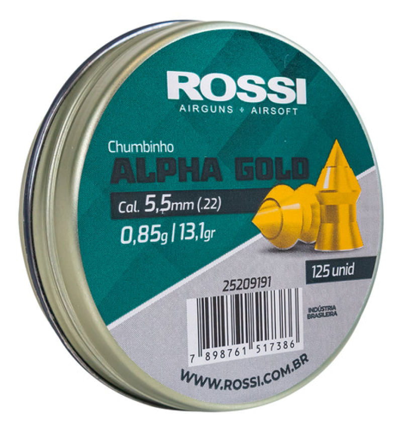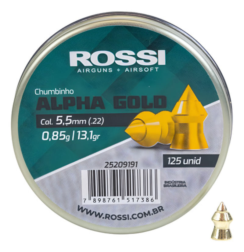 Chumbo Rossi Alpha Gold 5,5mm Pontiagudo 125un Pontiagudo e padronizado: alta penetração e bom agrupamento para carabinas potentes. Embalagem com 125 unidades em lata resistente — performance e consistência para treinos e aplicações que exigem impacto direto.