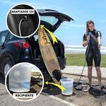 O Shower é um chuveiro portátil para ser utilizado em qualquer ocasião. Fabricado em polímero ABS, é leve e compacto, podendo ser carregado através de sua bolsa para qualquer local. Com adaptador incluso, basta ligar ao acendedor de cigarros do veículo, mergulhar a bomba em um balde cheio d'água ou direto de uma fonte, ligar que um jato de água irá sair da ducha. Seu formato anatômico com acionamento rápido, possui suporte para pendurar ou pode ser fixado ao vidro do veículo. Libera até 8 litros por minuto e possui 35W de potência com regulagem de saída de água. Acompanha suporte, ventosa, ducha, bomba d?água e bolsa com gancho. Não possui função de aquecimento.