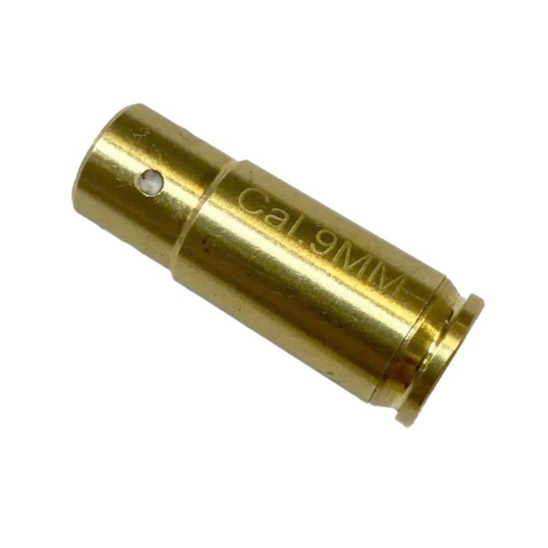 Fabricado em metal (latão de alta qualidade), ele possui as mesmas dimensões de uma cápsula verdadeira, mas conta com um emissor de laser vermelho interno, projetando o ponto de impacto para melhor ajuste das miras (alça e massa) e red dot.