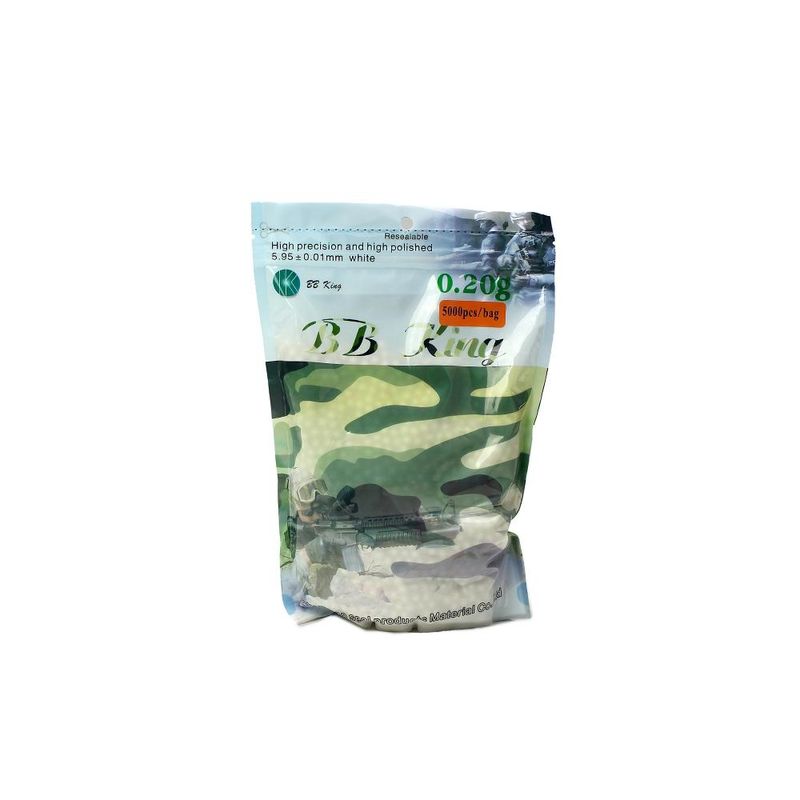 Esferas plásticas de alta precisão e polimento da BB King para equipamentos de airsoft calibre 6,0 mm. Embalagem "abre e fecha" com 5.000 unidades brancas de peso 0,20 g. Nunca reutilizar as munições, isso evitara danos em seu equipamento, optar sempre por esferas de boa qualidade e sem rebarbas, desta forma terás maior precisão e acuidade em seus disparos.