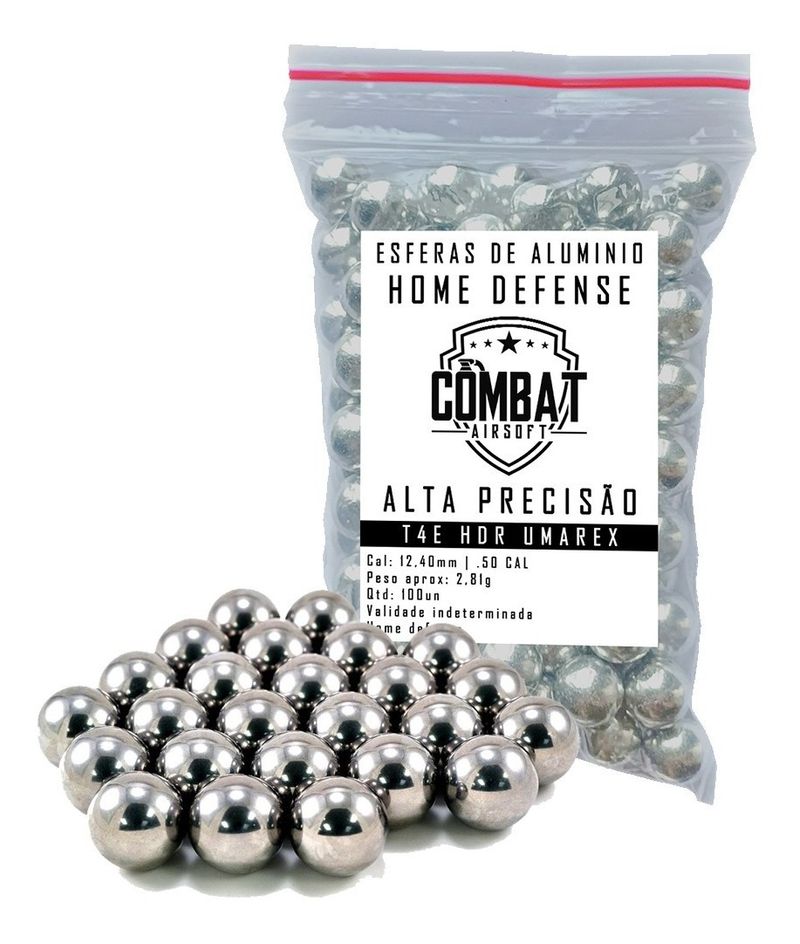 Esferas Alumínio Revolver T4e Hdr Umarex .50 - 100un- Combat Novidade!! Esferas de Alumínio .50 Combat Airsoft são projéteis esféricos metálicos utilizados, especificamente, como projéteis para armas de Defesa pessoal ou Tiro esportivo. Esse tipo de item é confeccionado de acordo com as normas ISO 9001 que asseguram a qualidade das peças e também a sua garantia. As esferas alumínio são utilizadas por contar com tamanhos específicos, sendo confeccionadas tanto em 4,5mm, 6mm e agora chega ao mercado em 12,40mm, projetil micro calibrado para revolver umarex T4e HDR As esferas Combat Airsoft, são fabricadas em material de primeira qualidade, pois esses, oferecem uma ótima proteção contra impactos, choques mecânicos, variações de temperatura e corrosão. As esferas confeccionadas em alumínio passam por um processo de lubrificação, para conferir melhor durabilidade e desempenho no equipamento em que serão inseridas, recomenda-se o uso em equipamentos com cano do tipo lizo que sejam do calibre 12,mm|.50, Para confirmar a compatibilidade se atente as especificações técnicas da sua Arma. Opção perfeita para atiradores que procuram munição de alta qualidade e excelente custo benefício para treinamento tático militar ou para defesa pessoal.