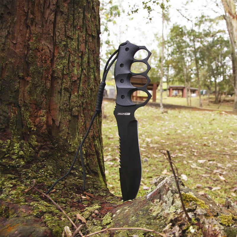 A Armada é uma faca, do NTK Tático, é fabricada artesanalmente e possui alta qualidade. A Armada é um modelo de faca muito utilizado por militares, por conta de seu design e empunhadura. Faca com design extremamente diferenciado, lâmina em aço inox com desenhos vazados e formas serrilhadas para dar um aspecto único. Cabo com detalhe em madeira e com empunhadura na forma de soco-inglês. Vem numa bainha em courino flexível com botão de armazenagem e cordim no cabo que otimiza seu uso. Perfeito para levar em acampamentos e missões táticas!