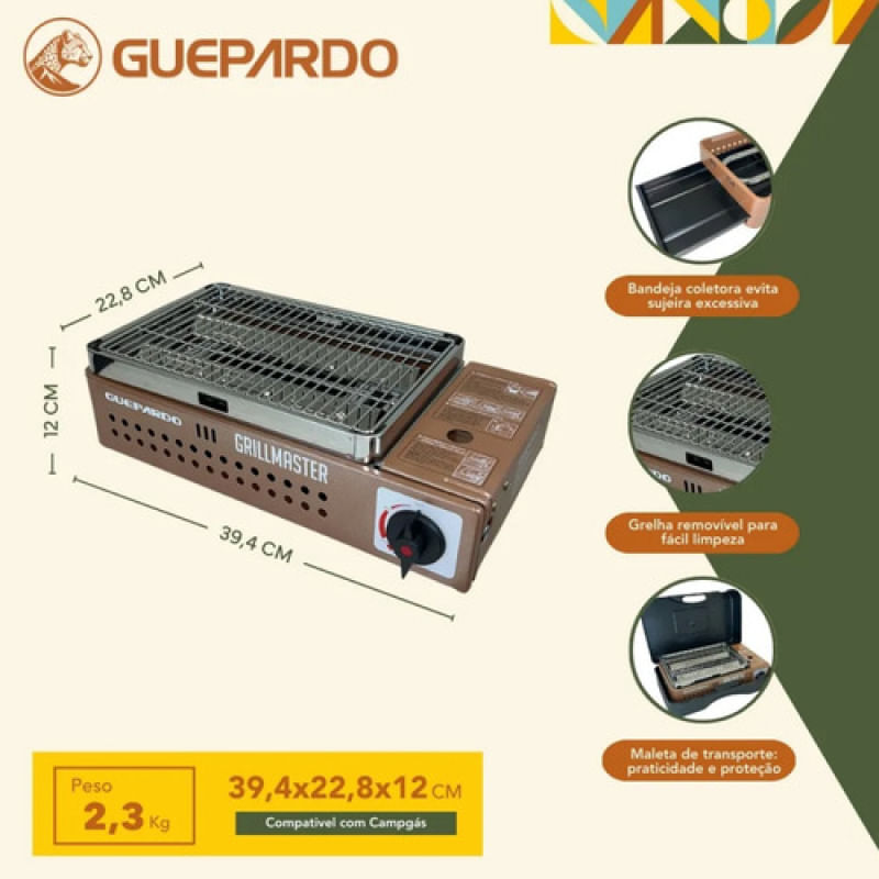 Fogareiro Horizontal Grillmaster Guepardo Flex Fuel Ideal para camping, pesca ou motorhome, o Grillmaster oferece potência e praticidade. Com grelha removível, acendimento automático e sistema Flex Fuel, pode ser usado com cartucho ou botijão de gás.