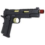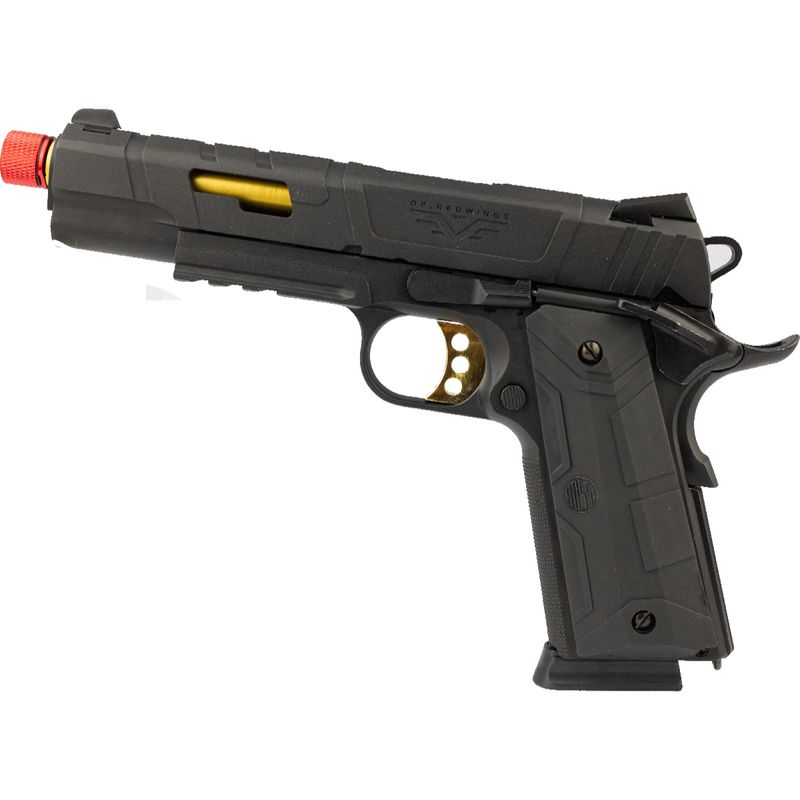 Pistola Airsoft Rossi Redwings 1911 tem seu funcionamento por Green Gas (podendo ser hibrida para CO2) com Blowback e alcança velocidade de 300 fps 91 m/s*. Corpo da pistola em nylon e metal na cor preta e com ponteira com pintura metálica vermelha.