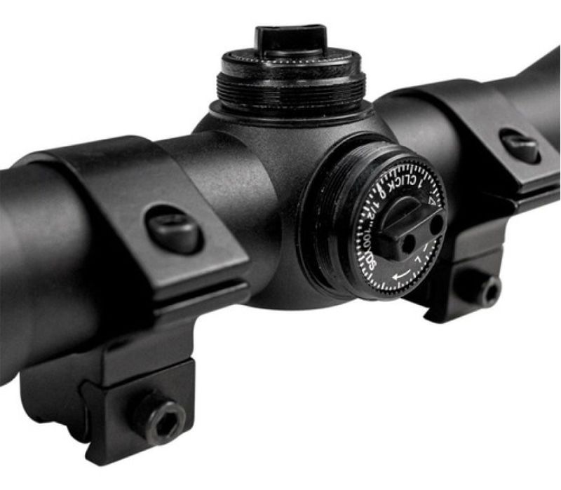 Esse modelo possui o zoom fixo de 4 vezes com uma objetiva de 32mm de diâmetro. Assim, você consegue enxergar alvos de uma distância de até 100 jardas, ou 91,4 metros. Contém tampas de proteção para as lentes, feitas para proteger e evitar danos e riscos à sua luneta aumentando a vida útil. O equipamento possui o Mount 3/8 11mm em metal com chave allen para instalação (suporte para trilho acoplado), isso proporciona maior conforto e custo benefício! Ela é recomendadas para carabinas com potência até 27 Joules, e não é indicada para carabinas com potências maiores. A regulagem é feita por clique rápido por torre, vertical e lateral. Cada clique equivale a um deslocamento do ponto de impacto de 1/4 a 100 jardas de distância (6,35 mm a 91,4 m)