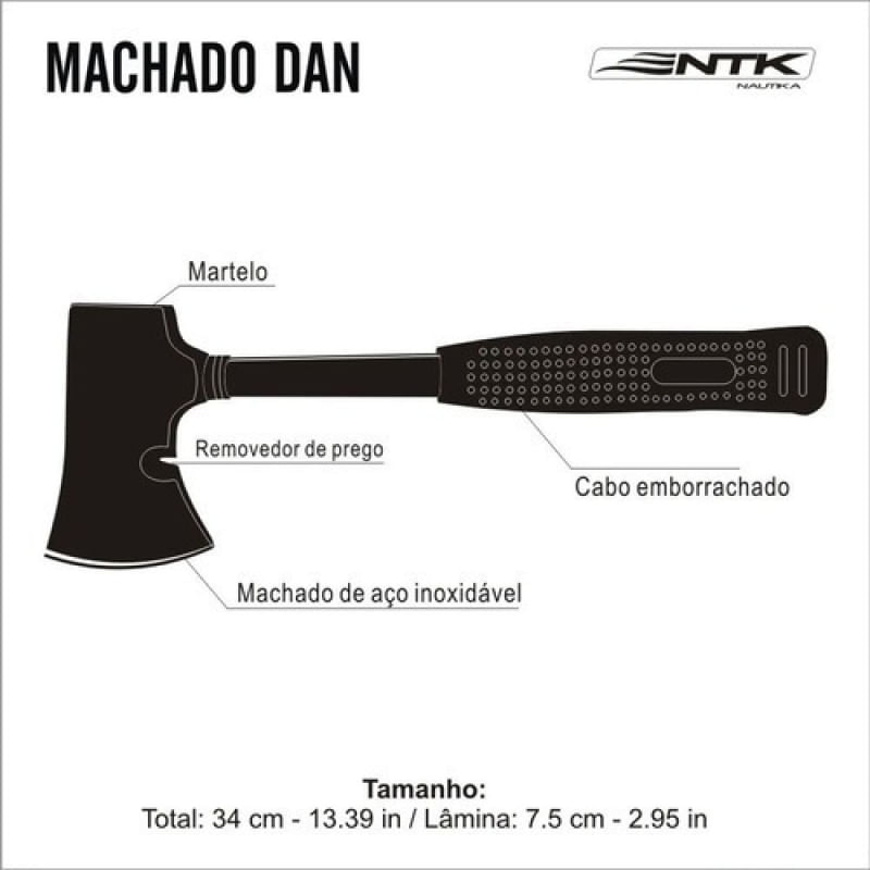 O Machado Dan da Nautika é um modelo que possui lâmina em aço inox, com fio de corte e extrator de pregos e farpas. O cabo é emborrachado e antideslizante, para melhor segurança durante a manipulação, e é texturizado de modo a deixá-lo com um com um melhor visual, além de logicamnete auxiliar no gripping. E para melhor segurança e organização de seu produto, inclui estojo para a cabeça do machado.