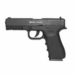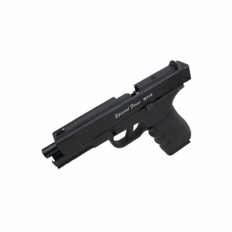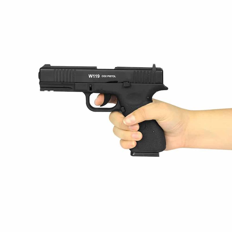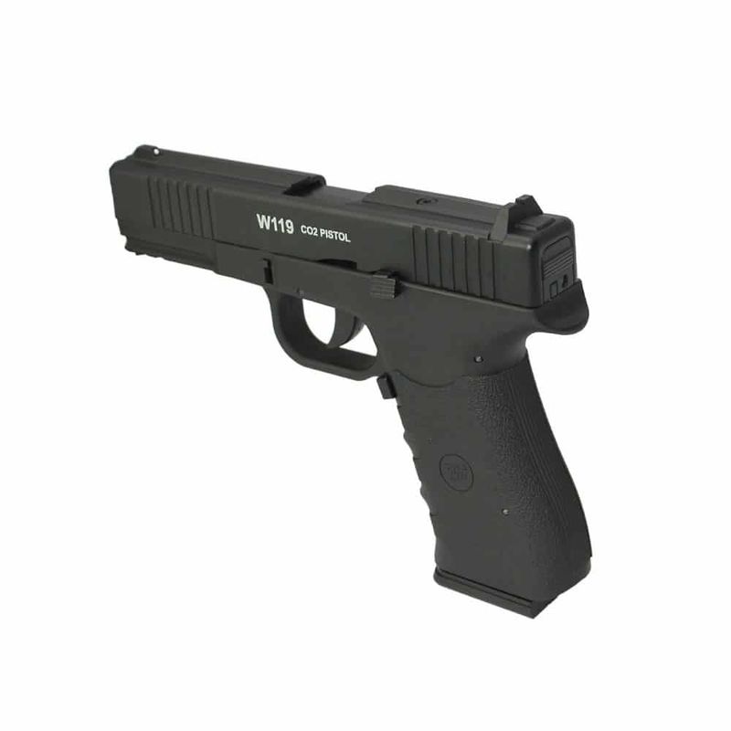 Esta Pistola CO2 W119 Versão Glock de esferas de metal calibre 4,5mm, vem com Slide em Metal, corpo em Polímero de alta resistência, tem a função Blowback (mecanismo que simula recuo do disparo), além de magazine para 16 esferas.