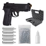 Pistola Airgun M9 4,5mm + 5 CO2, 1000 Esferas e Maleta A Pistola Airgun Beretta M9 4,5mm Co2 Rossi/Wingun é um modelo de alta potência na linha de pistolas impulsadas por CO2, com a sua enorme potência e desempenho. O desempenho da Pistola M9 4,5mm da Rossi é potente, com desempenho incrível e com um design de ponta. Produzida no mesmo acabamento da pistola Beretta Elite II da Umarex, a Rossi M9 4,5mm é uma pistola bem acabada, forte e precisa. Sem dúvidas essa pistola promete muito desempenho e full perfomance, ou seja, tudo aquilo que você precisa para o seu tiro ser excelente!