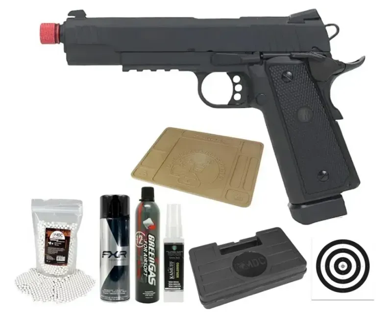 Pistola Airsoft Gás GBB 1911 Hi-Capa Black OPS Full Metal 6mm + BBS + GBB + Case + Alvos + Kamuff + Desengripante / Anticorrosivo + Tapete Para Manutenção