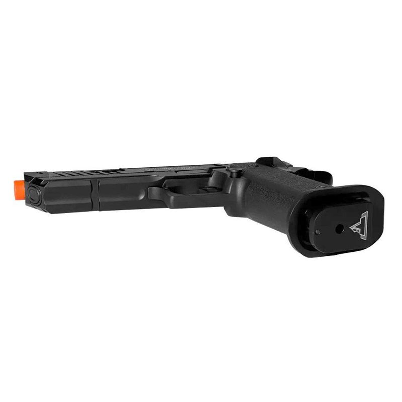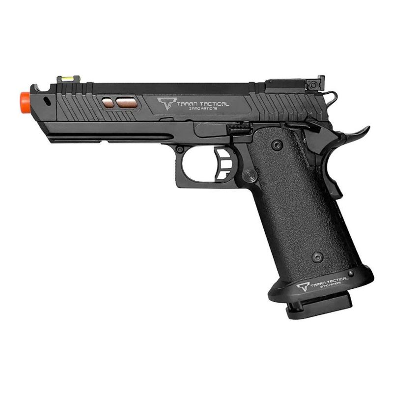 Possui também slide aliviado, o que permite um recuo mais intenso, além de uma empunhadura exclusiva e personalizada Taran Tactical e travas de seguranças totalmente funcionais, incluindo beavertail safety e trava de ferrolho.