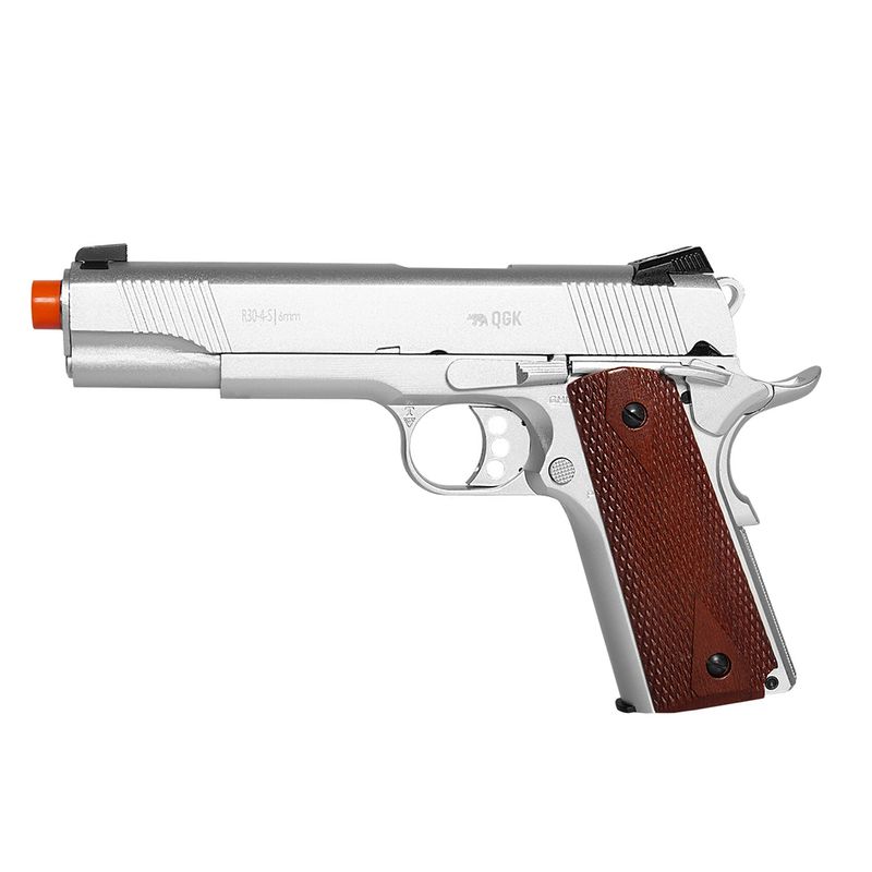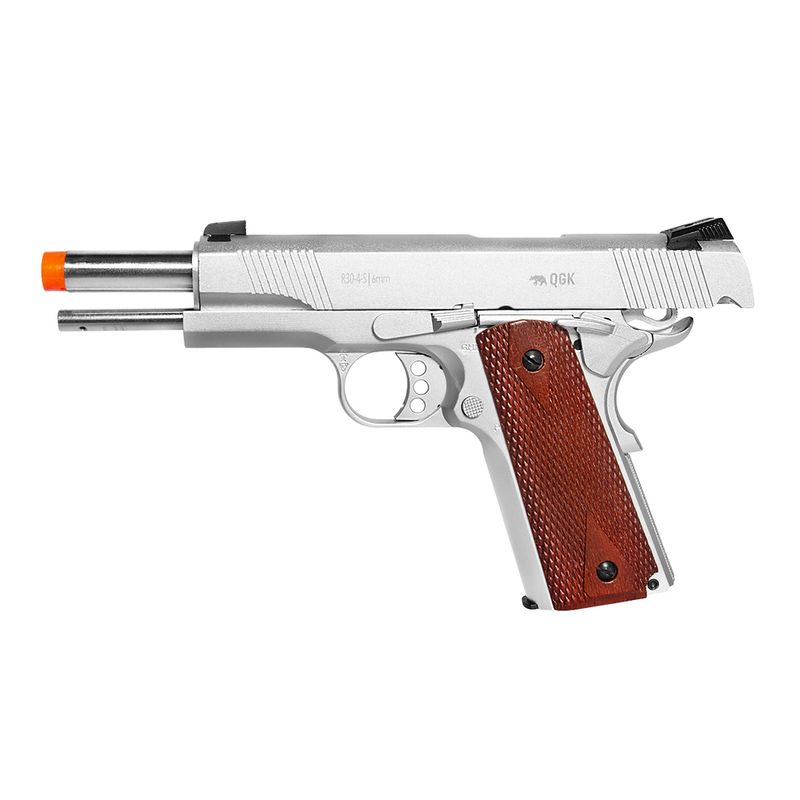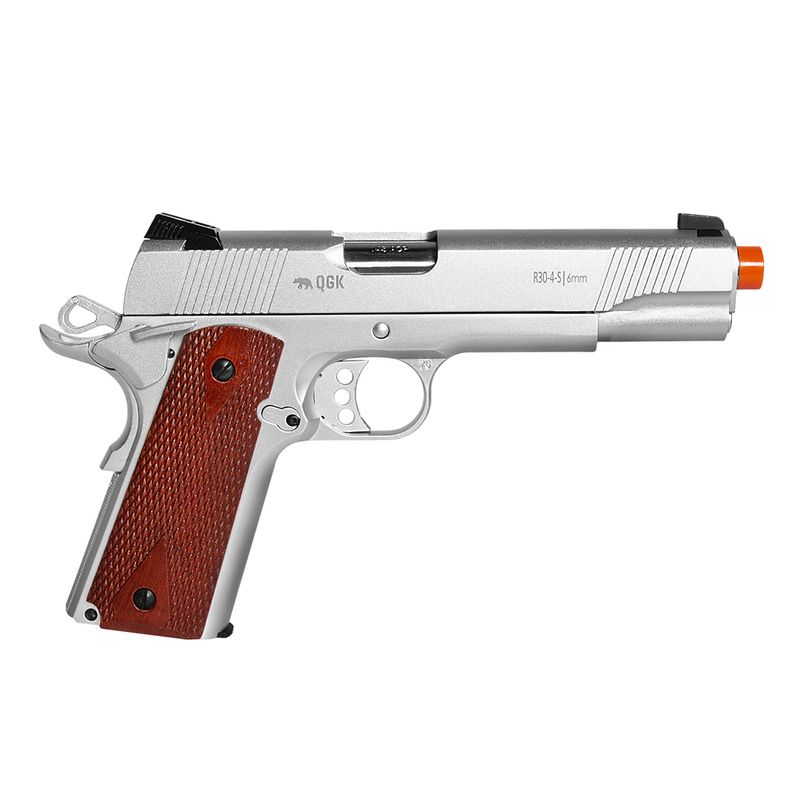 A pistola Airsoft M1911 V12 R30-4-S da QGK é uma pistola que não oferece só beleza, mas também qualidade, preço e durabilidade. Seu modelo já é bastante conhecido. Se trata de uma réplica em airsoft da famosa Colt 1911, pistola lendária e incrível. A QGK R30 4s possui uma empunhadura ergonômica confortável e uma ótima pegada confortável. Seu magazine é em metal, preto e oferece capacidade para até 25 BBs de airsoft 6mm. A R30 4 S da QGK possui um ótimo desempenho de 300fps de velocidade com BBs .20g. Além disso, o Hop-Up é ajustável. Para acessá-lo basta acionar as travas laterais e remover o Slide.
