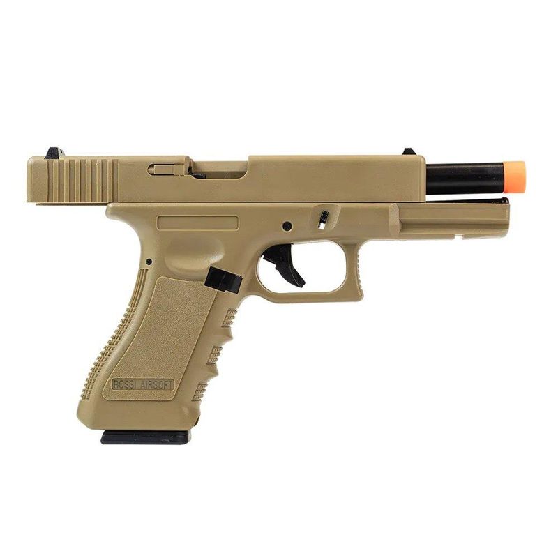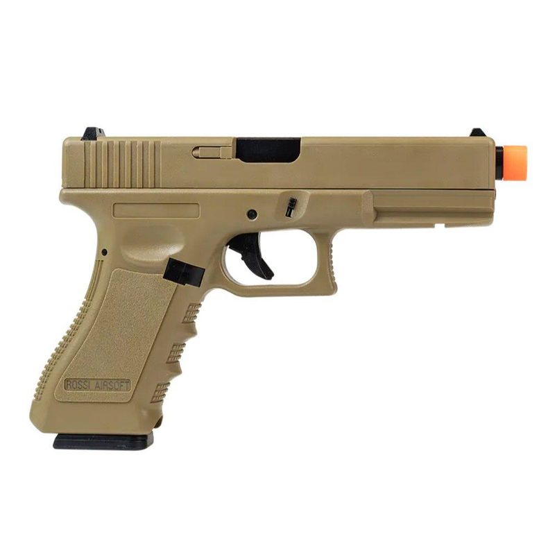Alto desempenho e blowback funcional, são as principais características da Pistola de AirsoftGreen Gas V17 Tan Blowback 6mm da Rossi, com velocidade de 290 FPS, magazine para 23 bbs e muito mais.