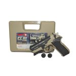 A pistola CO2 PT-80 Semi-automática com carregador de clip rotativo para 08 tiros. Tem suas miras fixas e trilho inferior 20 mm. Construída com um cano de aço da classe de competição, o que garante extrema precisão.