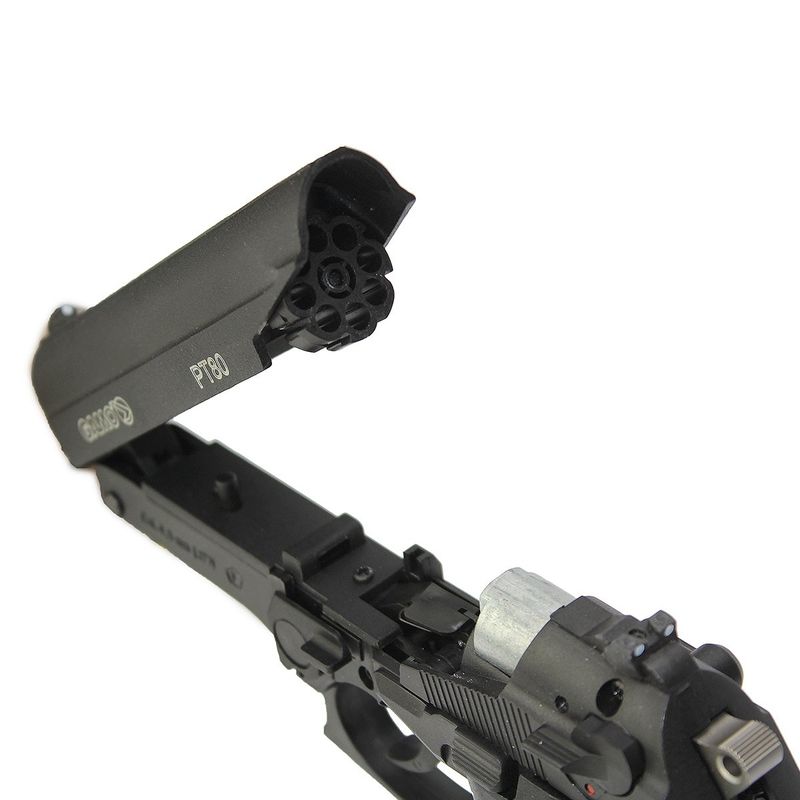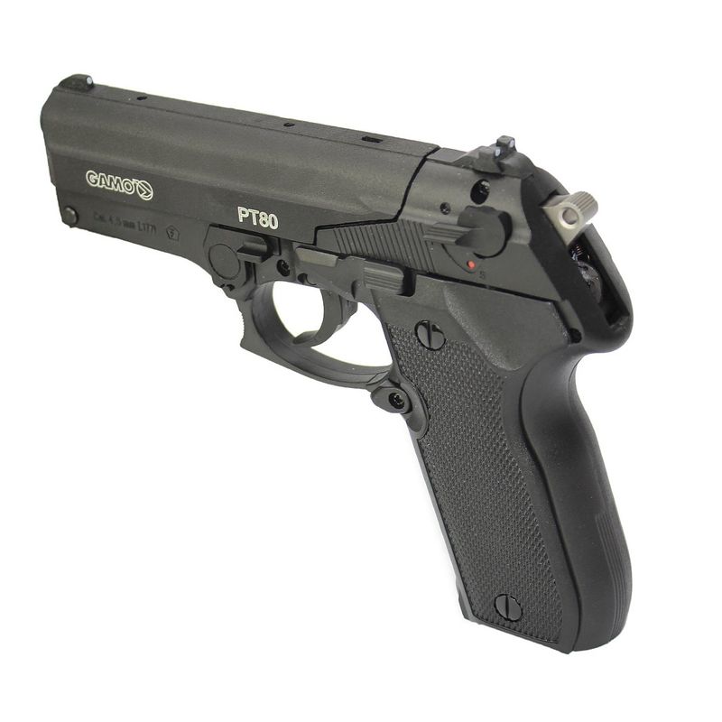 A PT-80, é uma pistola de pressão CO2 que utiliza chumbinhos no calibre 4,5mm. Possui uma autonomia de tiro até 30% maior que modelos com blowback, podendo efetuar em torno de 80 a 100 disparos com apenas um cilindro de CO2 de 12gr. Conta com dois tambores rotativos intercalados, com capacidade para 8 tiros cada, um cano de aço raiado que torna a pistola muito precisa, e velocidade inicial de até 125 m/s (410 fps) com chumbinho PBA Platinum da Gamo. Possui ainda opções de gatilho simples ou de dupla ação.