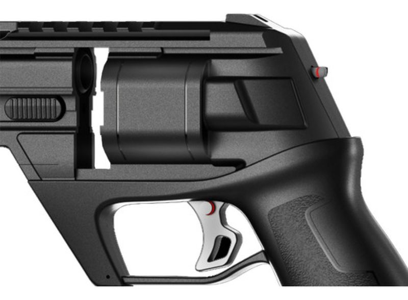 Utiliza um magazine estilo tambor rotativo com capacidade para 6 munições.