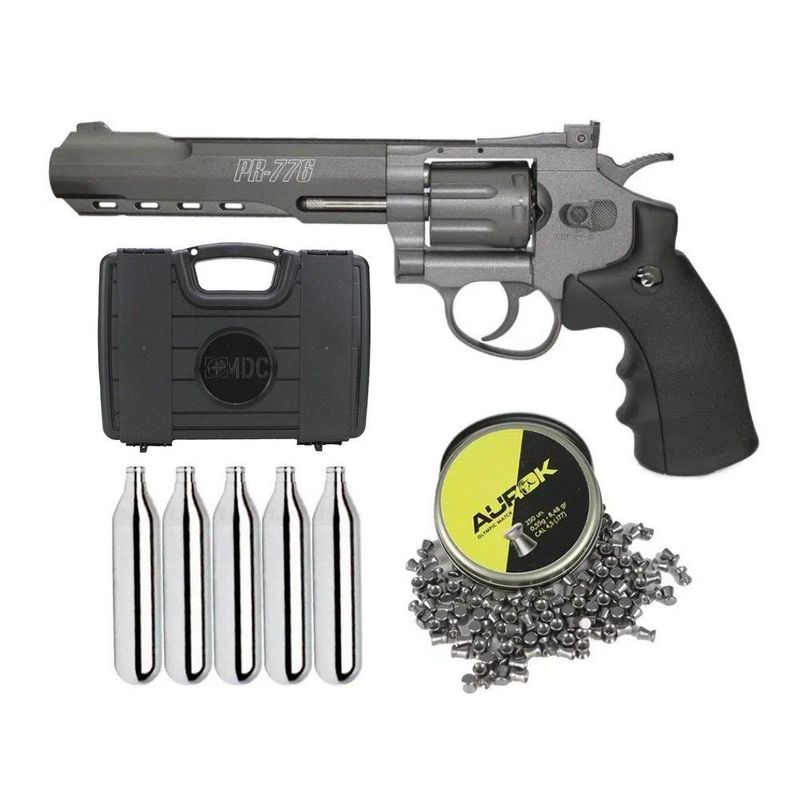 Revólver de Pressão CO2 Gamo 6" PR-776 Full Metal 8 tiros 4,5mm + 5x Cilindro CO2 + Chumbinho Aurok Olympic 250uni + Maleta/case rigido MDC
