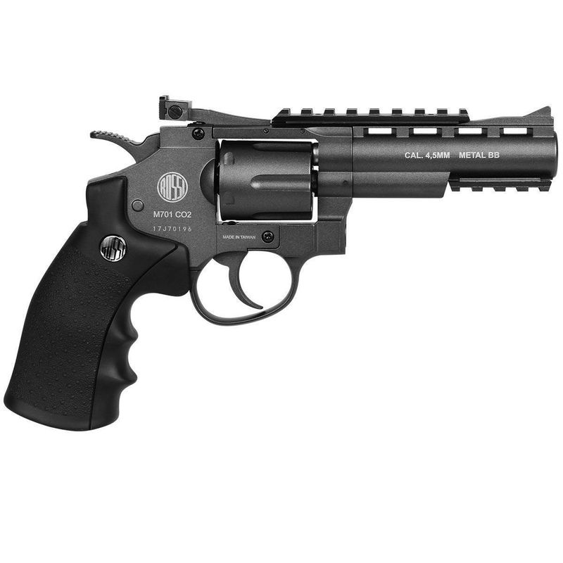 REVÓLVER PRESSÃO CO2 ROSSI M701 FULL METAL - 4.5MM Um magnífico Revolver de Pressão CO2, este Revólver Rossi Full Metal é muito real. O Revólver CO2 Rossi pode ser considerado uma peça de colecionador, tamanho a perfeição deste produto. Pode ser utilizado para tiro ao alvo como esporte e lazer ou mesmo por atiradores mais experientes em treinamento. Seu tambor para 6 tiros tem o funcionamento igual a real. Ele funciona em ação simples ou dupla. As esfera de aço são inseridos diretamente no tambor do revólver. Em seu cano ela leva a inscrição licenciada da Amadeo Rossi.