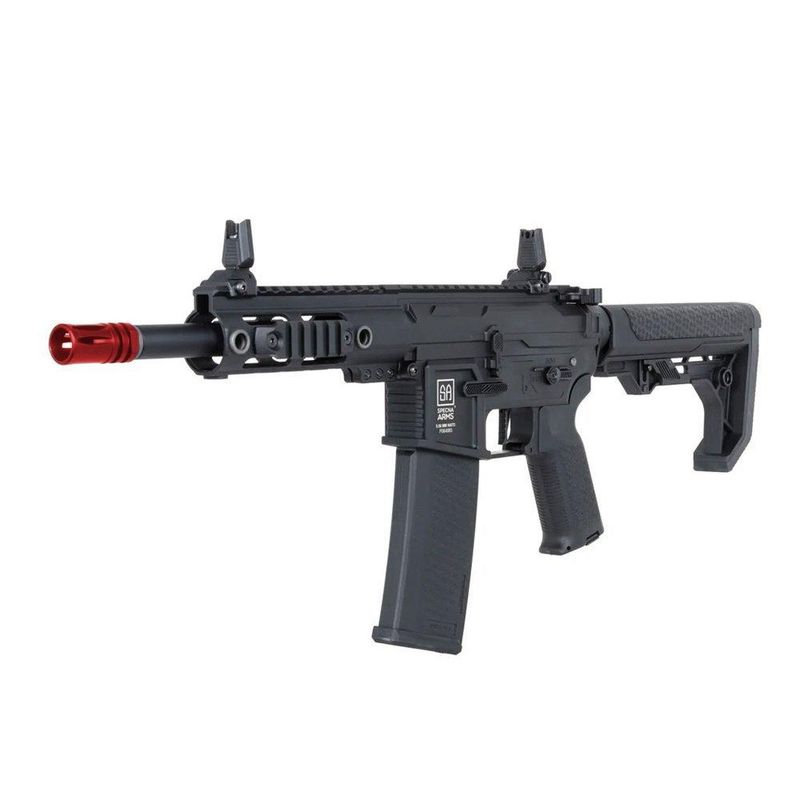Pensando em conforto e mobilidade, a Specna Arms utilizou polímero de alta densidade e fibra de nylon na construção do corpo, handguard e empunhadura. Essa combinação reduz significativamente o peso total do rifle sem comprometer a resistência estrutural, resultando em um equipamento ágil, fácil de manusear e ideal para partidas prolongadas.