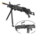 O Rifle Airsoft Support LMG M249 Light Rossi é uma imponente e de qualidade. É mais uma arma desenvolvida pela Rossi em parceria com a renomada fabricante de armas de airsoft da Specna Arms. acabamento em fibra de nylon, oferece extremo conforto ao operador pois o material equilibra o peso tornando-o mais leve e menos cansativo durante a prática jogos longos. Permite excelente mobilidade em partidas de CQB por ser um equipamento mais curto e possuir coronha retrátil, permitindo que o rifle reduza de 93 para 80 centímetros. Dispara em modo full automático e é uma verdadeira máquina, realiza disparos de BBs 0,20g a uma velocidade de 370fps, ou seja, 112m/s. Com ajuste integrado de HopUp que auxilia na trajetória das BBs de airsoft nos disparos. O Hop Up favorece o sistema backspin fazendo com que diminua a resistência do ar durante a trajetória. Foi desenvolvida exatamente para oferecer aos operadores uma função de support, onde o atirador fica recuado e dando apoio aos soldados que avançam. Equipado com gearbox V2 e permite a troca rápida de mola e possui um pistão reforçado, com dentes e engrenagens em metal. Possui um magazine padrão HighCap para 300 BBs e compatibilidade com Magazines LMG A&K. Sua inserção é diagonal. A massa e alça de mira oferecem boa precisão e são protegidas por túnel de polímero, contudo, possui trilho de 22mm para acoplagem de Rede Dot e lunetas.
