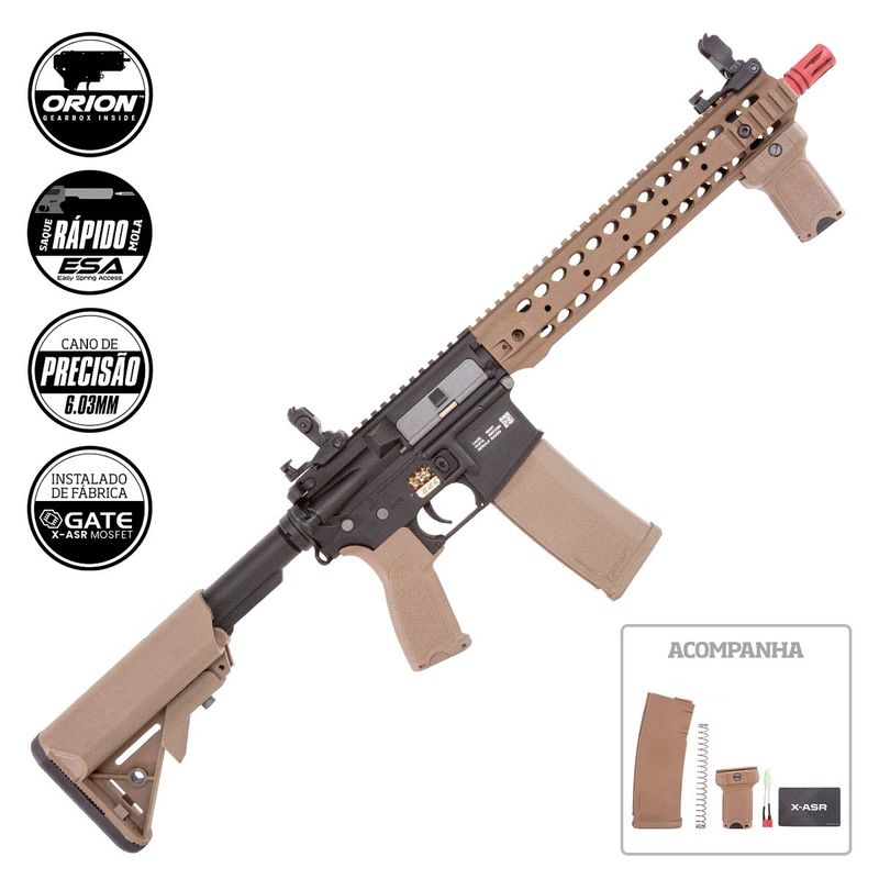 Rifle de Airsoft AEG M4 Carbine Long SA-E06 Half Black/Tan EDGE E-Series - Specna Arms + Capa + Bateria e Carregador + BB's! O Rifle SA-C03 possui dois modos de tiro, sendo eles: o modo semiautomático, os disparos são efetuados a cada pressão do gatilho.