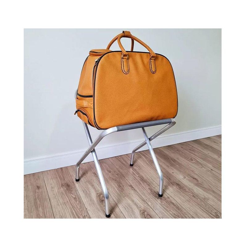 O Suporte Mala Cinza com encosto Zaka - Hoteis Pousadas Quartos é dobrável, o encosto mais alto na lateral ajuda na estabilidade da mala, prático e leve. Com capacidade de 100kg, suporta diversos modelos de malas. Proporciona ambiente mais organizado e mais bonito.